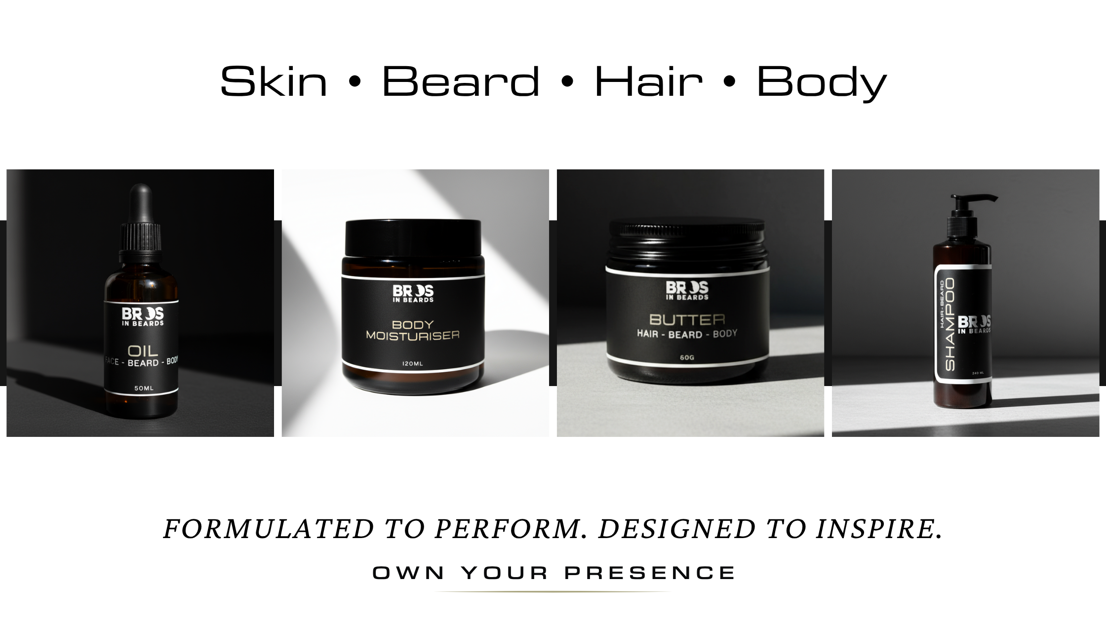 At Bros in Beards, we specialise in making high quality beard, hair, skin and body care products that are formulated to perform and designed to inspire. Our range includes Oils, Butters, Balms, Moustache Wax, Face Cleanser, Body Moisturiser, Body Wash, Shampoos, Conditioners and more, each crafted with premium ingredients to nourish, strengthen and style.